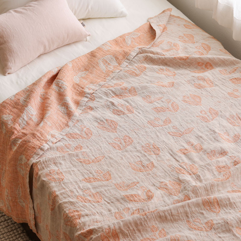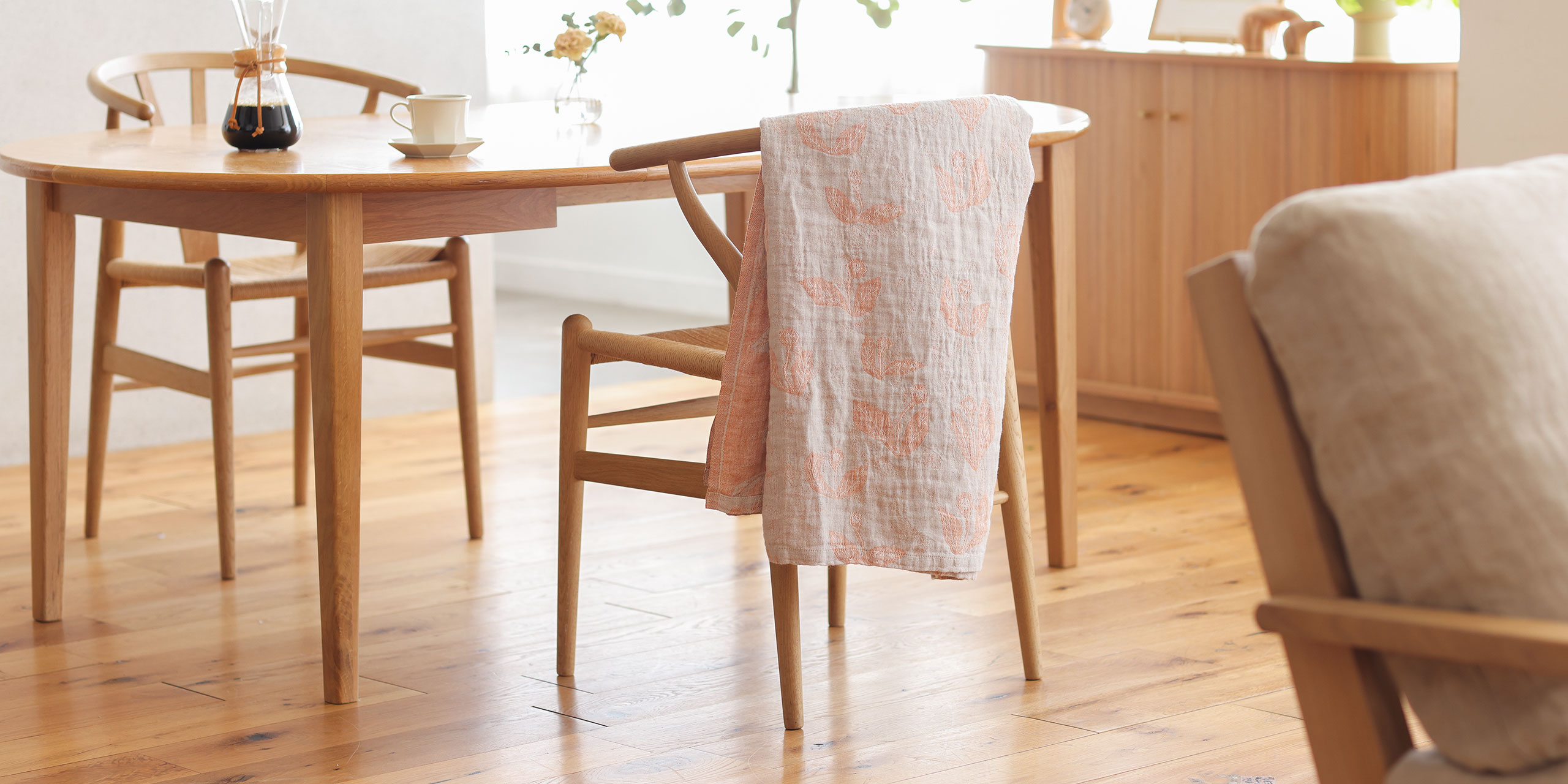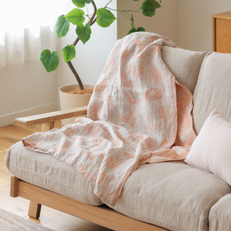 大きな一枚をソファーやベッドにさっと掛けるだけで、お部屋にやわらかなリズムが生まれ、景色がふっと動き出します。