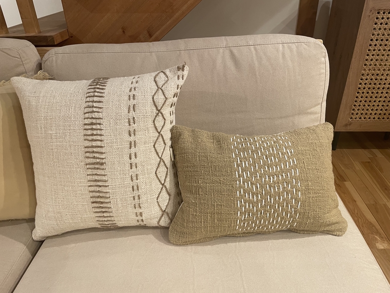 色合いや織りの表情だけではなく、サイズもリセノが提唱する落ち着きあるナチュラルヴィンテージにぴったりのクッションカバーができました。