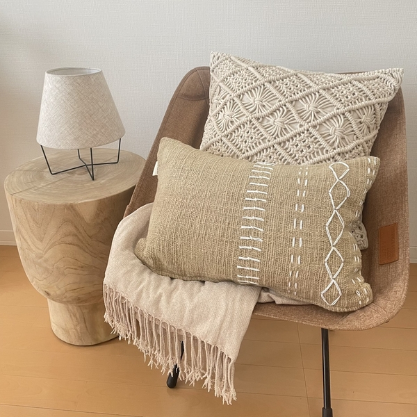 無地やシンプルなデザインでは物足りなさを感じる方や、こってりとした柄物だと重たいなと感じる方に、ぜひ取り入れていただきたいクッションカバーです。