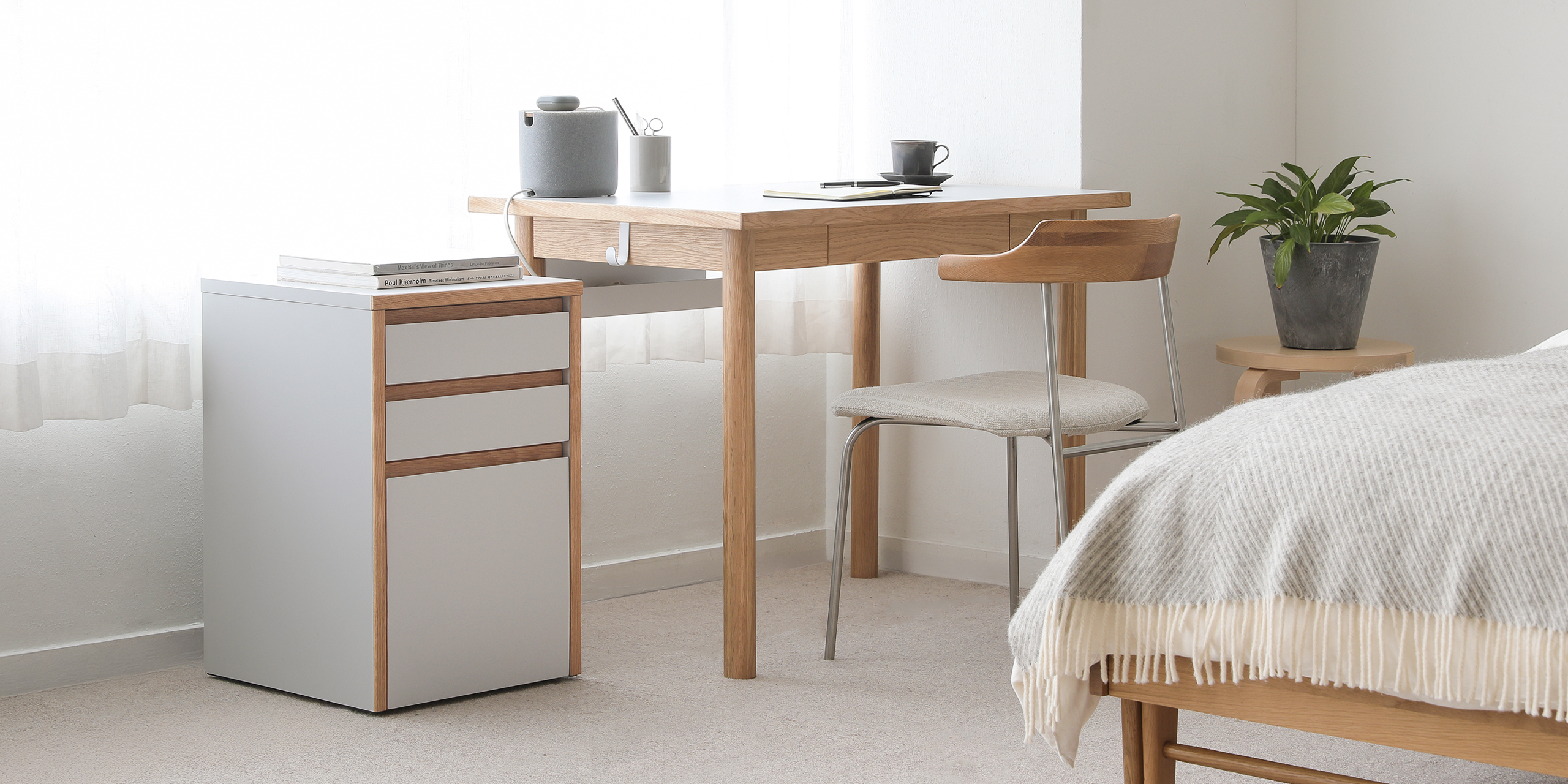デスクの中に置いても、外に出しておいてもニュートラルカラーの抜け感で収納を増やしながらお部屋を広く見せることができます。