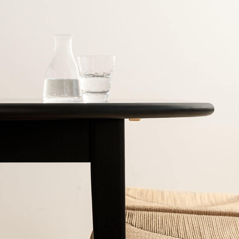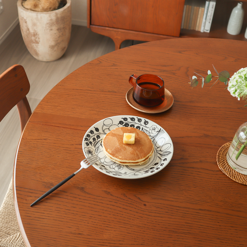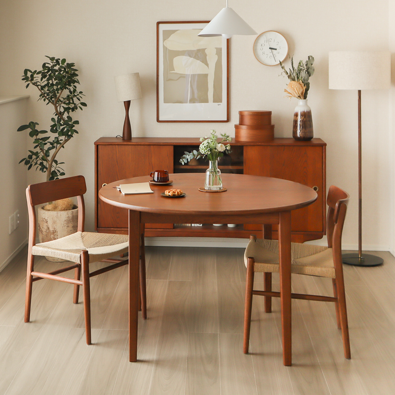 エクステンション天板を取り外すと、110cmの円形になり、エクステンション天板を付けると、170cmの幅広の楕円形ダイニングになります。