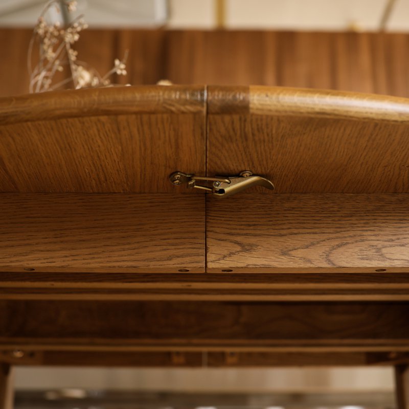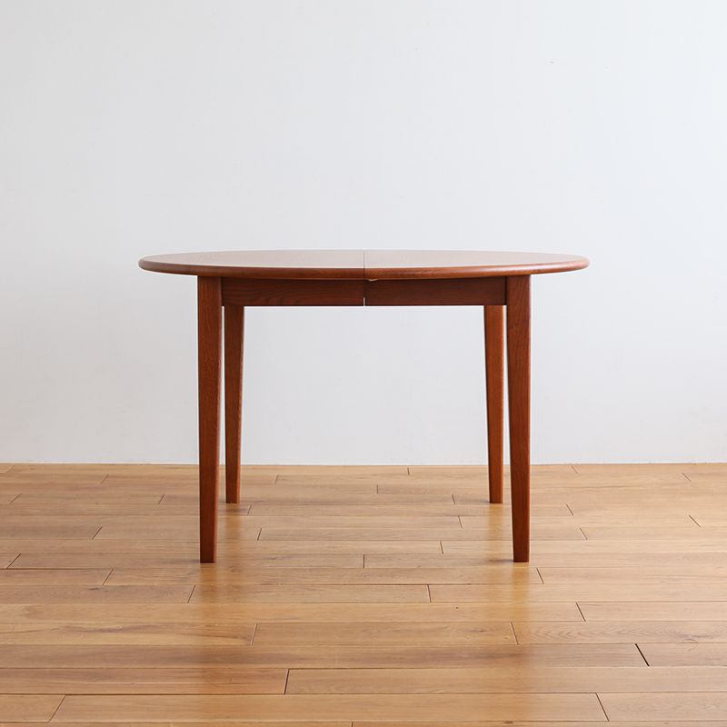 この仕様は、北欧ヴィンテージのダイニングテーブルでよく使われるのですが、大きな特徴として、伸長時に脚の位置も一緒に外側に動きます。