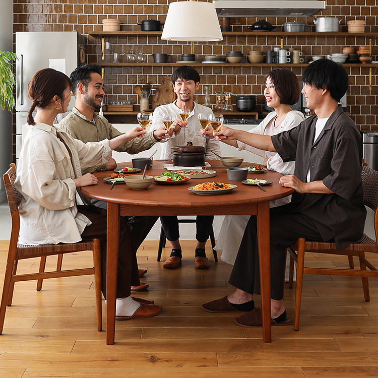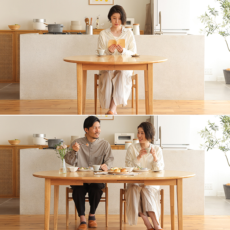 幅 110cmの円形から、幅 170cmの楕円形に可変が出来る、伸長式のダイニングテーブル。家族の成長や人数、シーンに幅広く対応し、生活にフィットします。