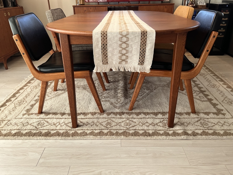 この仕様は、北欧ヴィンテージのダイニングテーブルでよく使われるのですが、大きな特徴として、伸長時に脚の位置も一緒に外側に動きます。