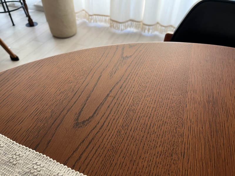 このダイニングテーブルは、奥行き(直径)が110cmあります。普通のダイニングは80cmくらいが多いですから、ずいぶんと贅沢なサイズです。