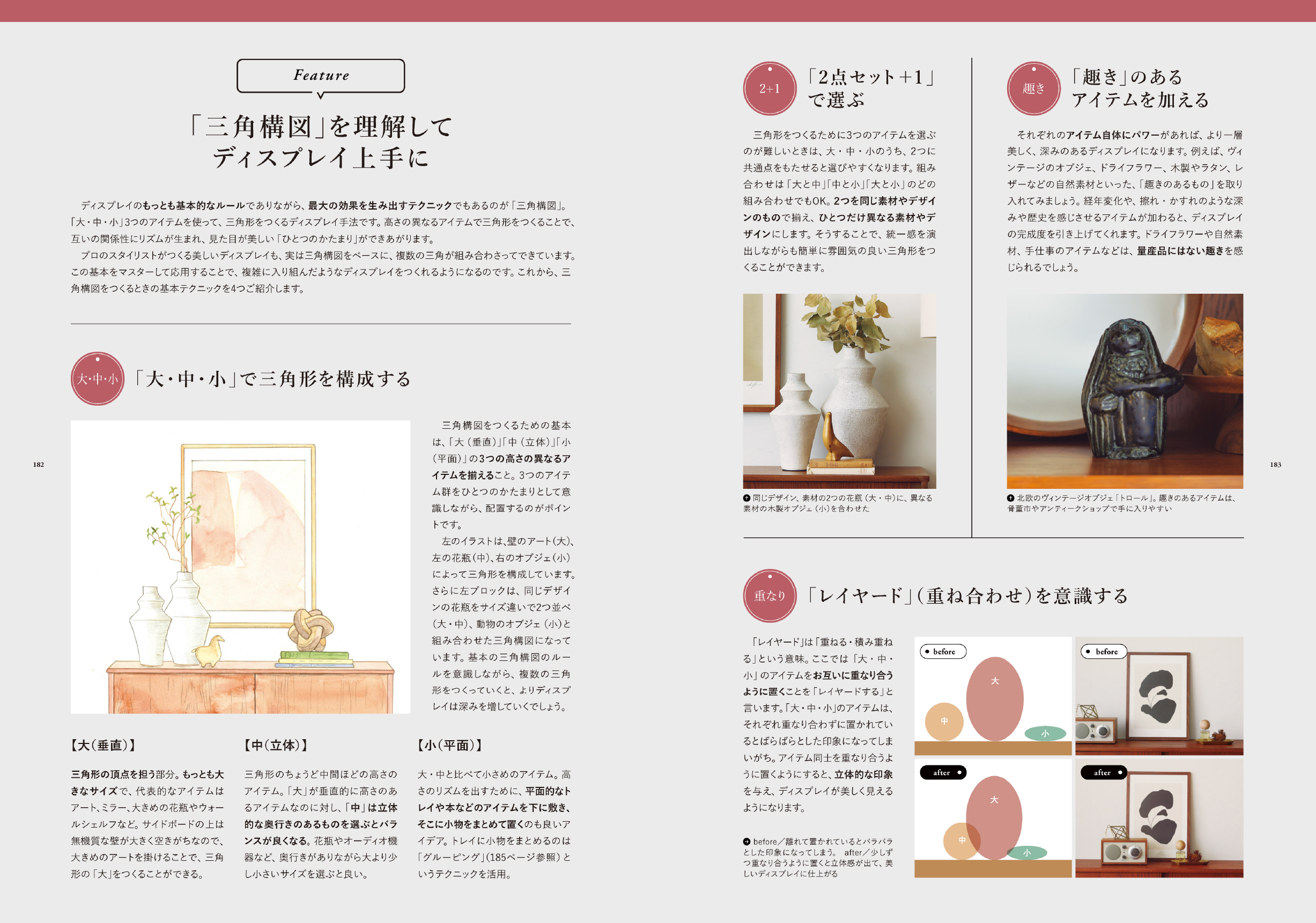 ページの構成は、①スタイリングをはじめる前に、②ベーススタイリングのセオリー、③ポイントスタイリングのセオリーとなっています。初心者の方でも、基礎から学んでいただけるように、インテリアの基本を丁寧に紐解きながら、前著よりも実践アイデアをたくさんご紹介しました。
