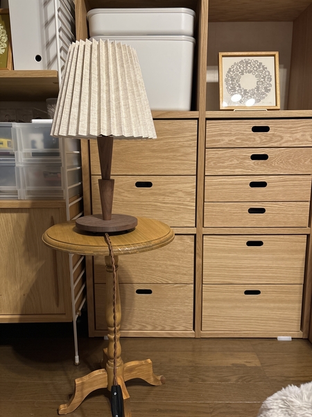 夜に見る奥行きのある表情とは打って変わり、綿麻でできたシェードの素朴さや、ウォールナットから感じられる木本来の温もりがはっきりと表れます。