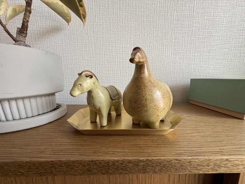 画像のように、三角構図の「小」を担うアイテムとしてトレーをお迎えすると、平面としての存在感が強まり、他との高低差が強調されます。より立体感のあるディスプレイに。