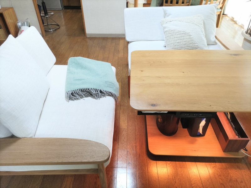 1.5人がけを2脚、昇降式こたつテーブルを囲んでL字に配置しました。