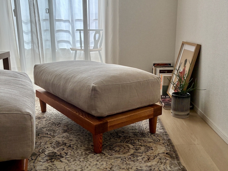 こちらのオットマンは「幅90cm × 奥行き50cm」と、あえて、長方形サイズに仕上げています。