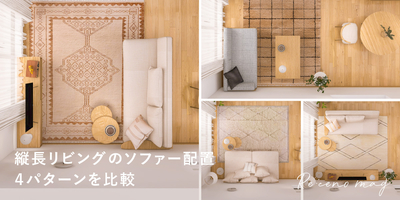 ソファーの置き方ひとつで、見た目の印象も使い心地も変わる縦長リビング。4つのレイアウトパターンを解説します。