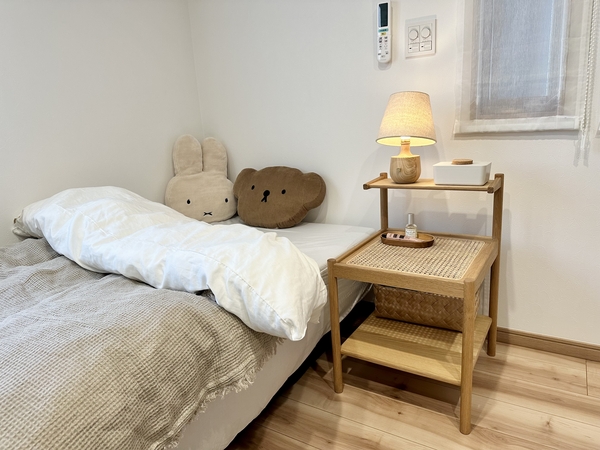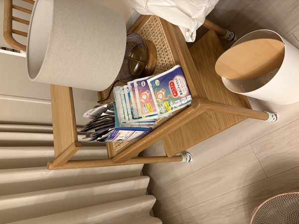 子供たちのおむつ替えセット、寝る前に読む絵本、ライトや時計、水筒などベット脇でごちゃごちゃと散らかっていたものが整頓できてスッキリしました。