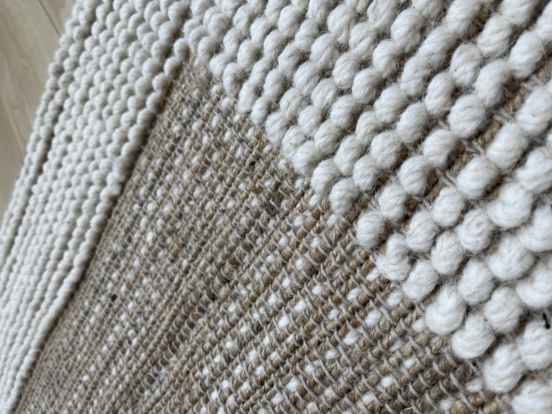 ジュートによるベージュカラーと、ウールのオフホワイトが交互に織られていることによって、表情が豊かになり、お部屋に複雑性をプラスしてくれます。