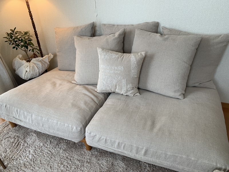 クッションはあえてシンプルな意匠にしてあるので、45cmサイズの織り柄のあるデザインクッションを合わせると、さらに素敵だったりします。