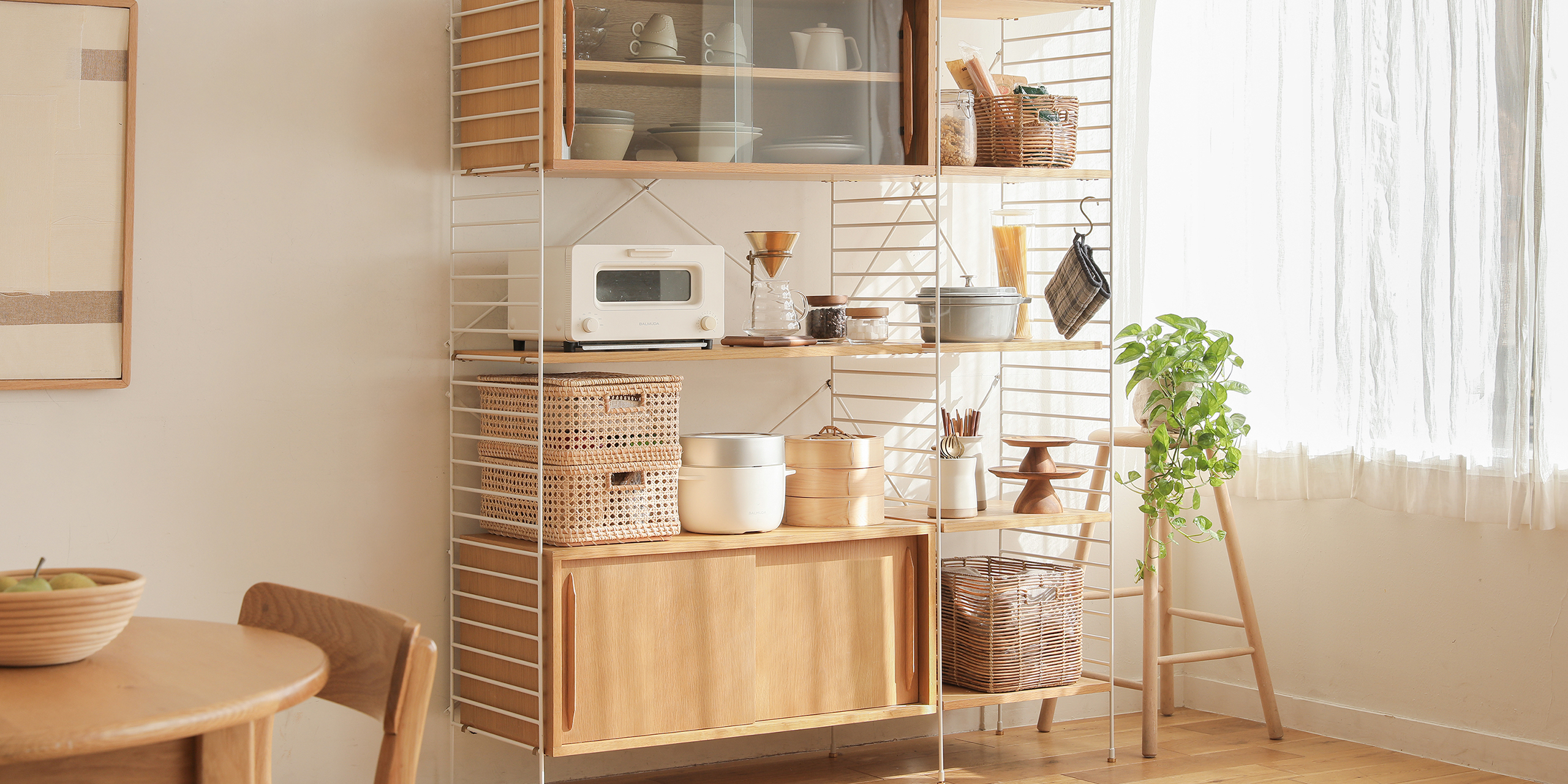 棚板で仕切れるので、食器や食料品のストックなど、細かく仕分けて収納するのに便利です。