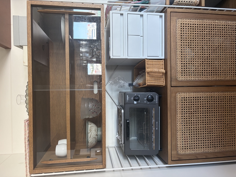 食器棚を新調するにあたり、ラタンキャビネットとガラス戸キャビネットを組み合わせ、自分だけのオリジナル食器棚にできました。見せたい食器はガラスキャビネットに収納しています。特にお気に入りは開く取手で、こちらのオシャレな見た目により、実家にあるようなガラスキャビネットよりスタイリッシュな印象になっていると思います。高さも自分の身長に合わせて変えられるのが、R.U.Sのいいところですね!