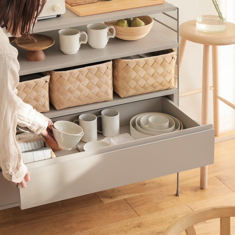 開口部が大きく出し入れしやすいドロワー。衣類や食器などを片付けるのに向いています。
