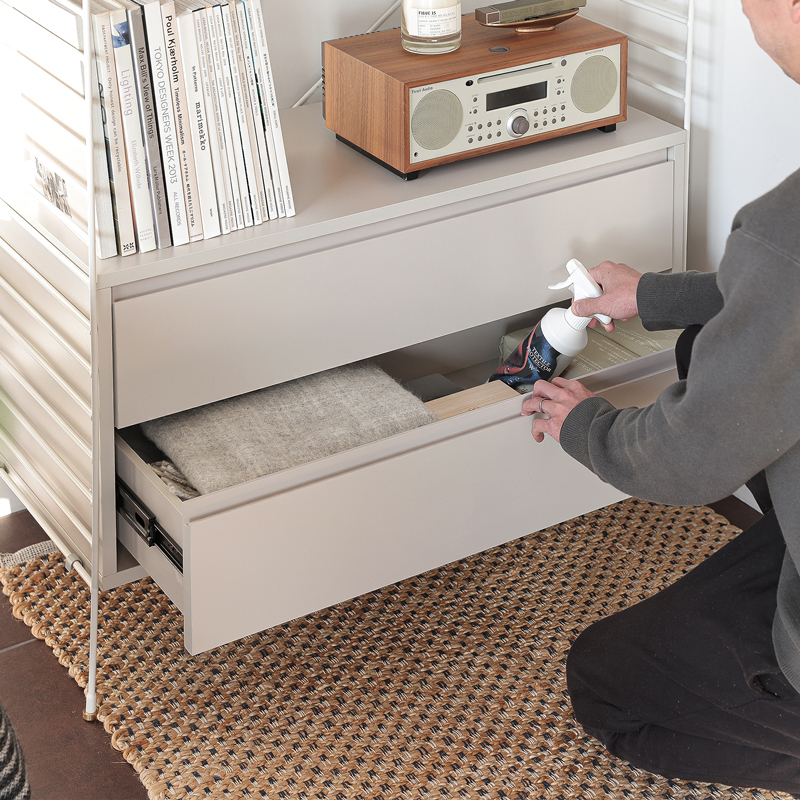上から順番に深さ違いの引き出しを備えている3段ドロワー。 小さな物から大きな物まで入れることができ、リビングや寝室では洋服ダンスとして、 キッチンでは、カトラリーからお皿や鍋までしまえるキッチン収納としてお使いいただけます。