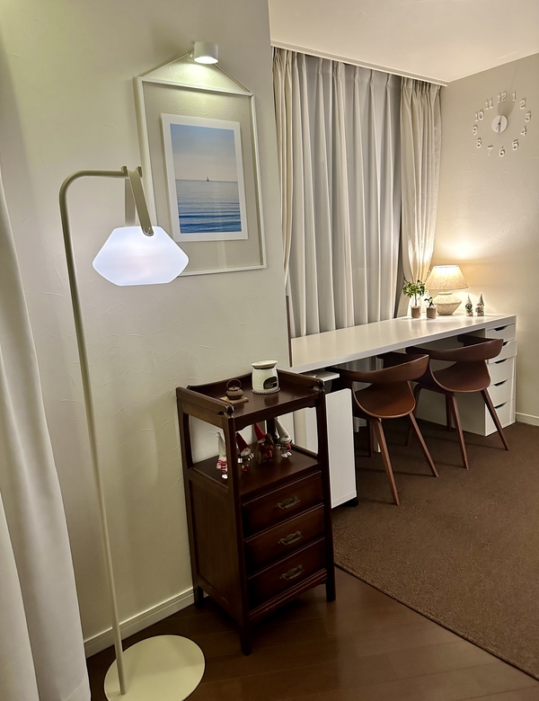 フロアランプは高さがあったり、コードがインテリアを邪魔するので、なかなかいいものが見つけられませんでしたが、すべてのわがままを叶えてくれるランプでした。
