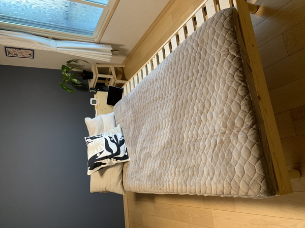 シングルのボックスタイプ、淡いブラウン寄り、黄色味のない茶系、薄いうすい赤みを感じる茶系のグレージュで、どの床や壁紙やベッドの色でも合わせやすいと思います