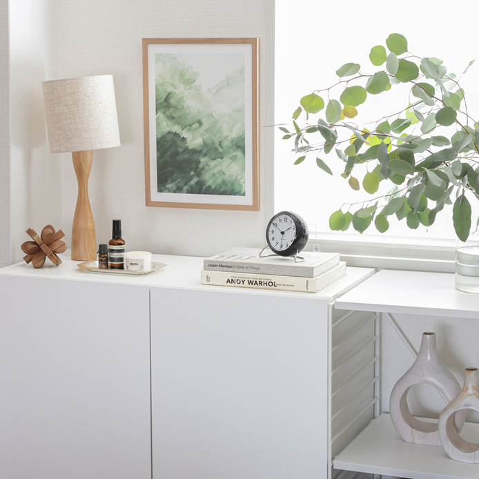 オープン収納の中にアートポスターが1つあると、そこが目を引くアイポイントに。