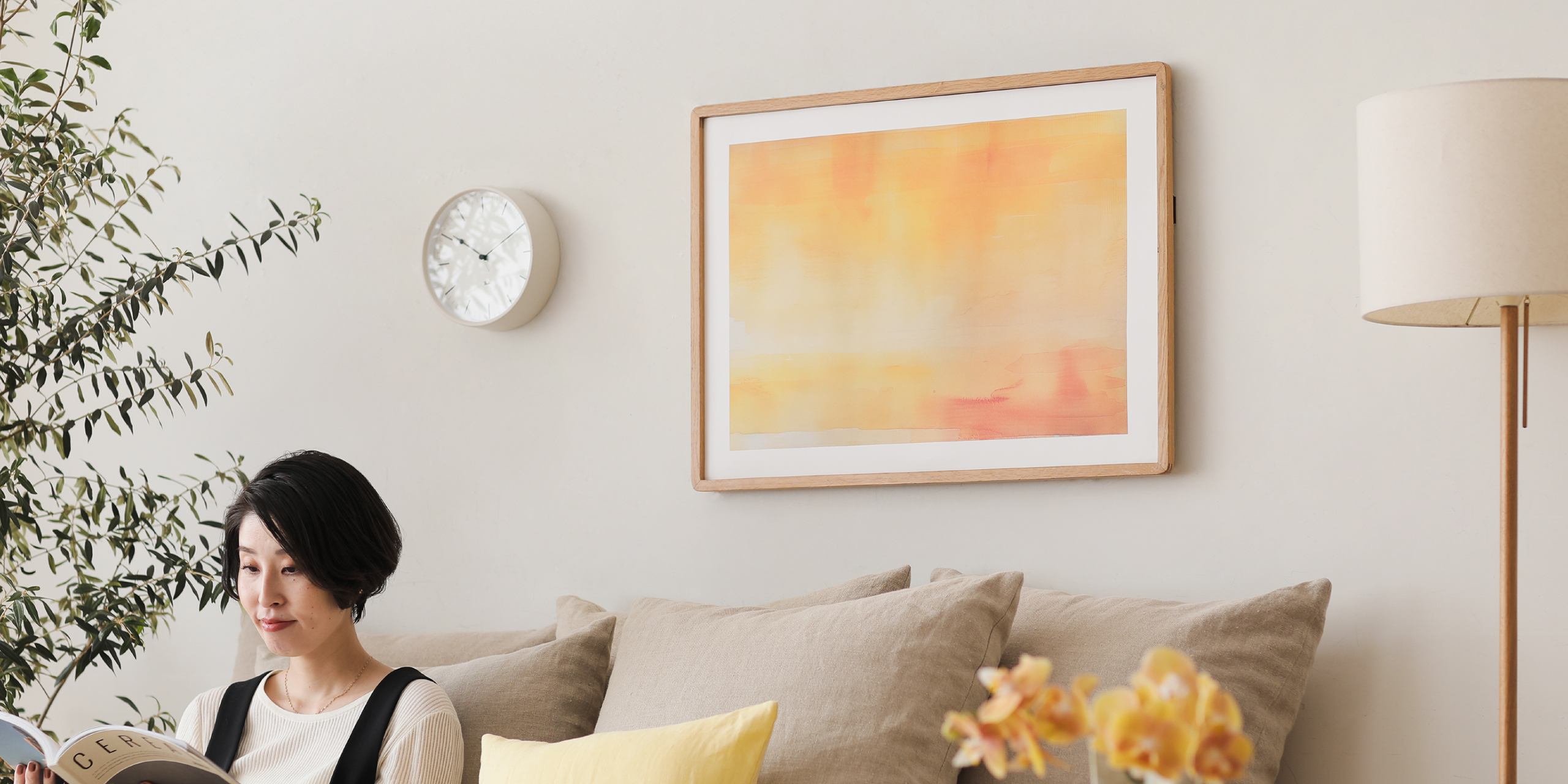 壁掛けのほか、卓上に立てて飾れるスタンドも付いているので、好きな場所にアートを取り入れられるのがポイント。