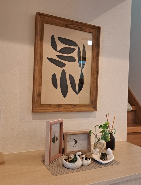 こちらの画像では、コンパクトな玄関収納の上に、A3サイズを飾ってみました。目に入りやすい壁を美しく飾ることで、疲れて家に帰ってきた日も、ほっと心が癒されます。