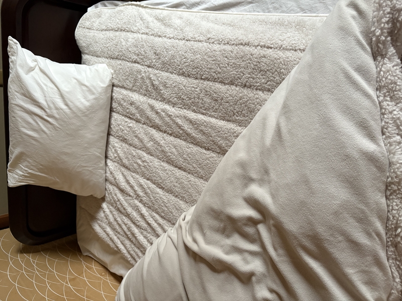 寒い季節におすすめしたい「敷きパッド Muku muku(ムクムク)」。羊の毛を思わせる、ふかふかのボア生地が、身体をふわっと包み込んでくれて、とても気持ち良いんです。