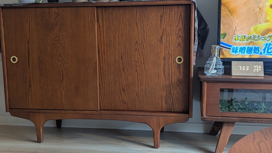 TVボードがお気に入りのヴィンテージのためなかなか色味が合ういい感じのがなかったのですが、こちらはヴィンテージ感ある色味とスマートな形がめっちゃお気に入りです。