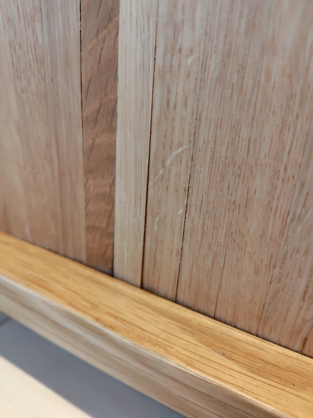 細く成形した無垢のオーク材を、1本1本繋ぎ合わせて、ひとつのドアに仕上げています。