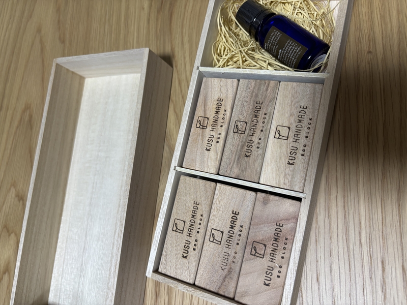 楠から取れる「カンフルオイル」には、自然由来の防虫・消臭効果があります。そんな楠の廃材を再利用し作られたブロックは、天然の防虫剤です。
