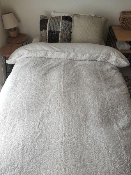 寒い季節におすすめしたい「掛け布団カバー Muku muku(ムクムク)」。羊の毛を思わせる、ふかふかのボア生地が、身体をふわっと包み込んでくれて、とても気持ち良いんです。