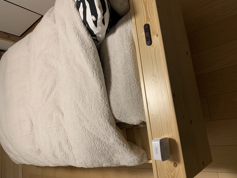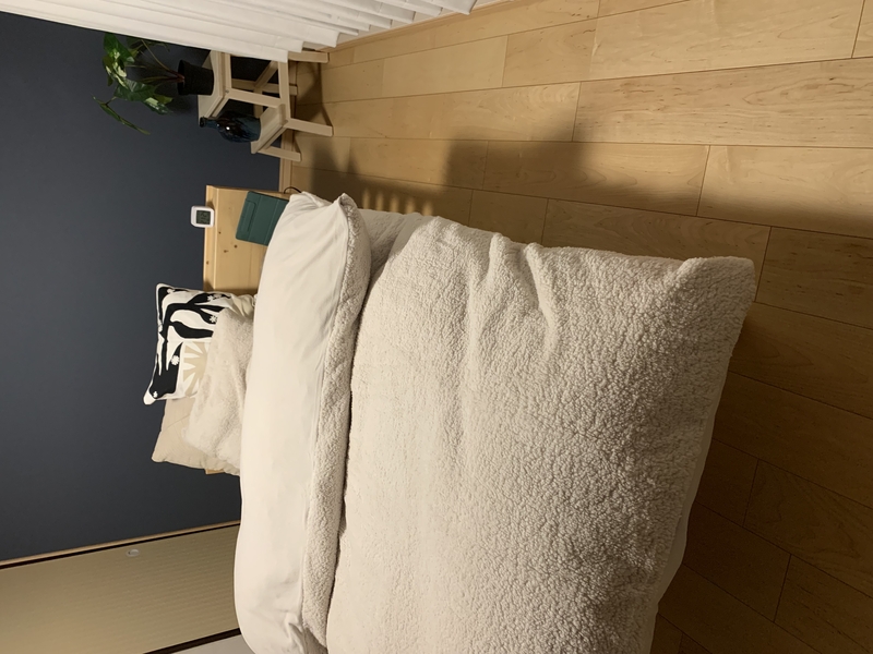 ちなみに、シングルベッドにセミダブルサイズのお布団をあわせていただくと、お布団の裾に余裕ができます。
