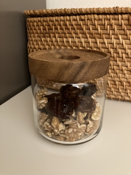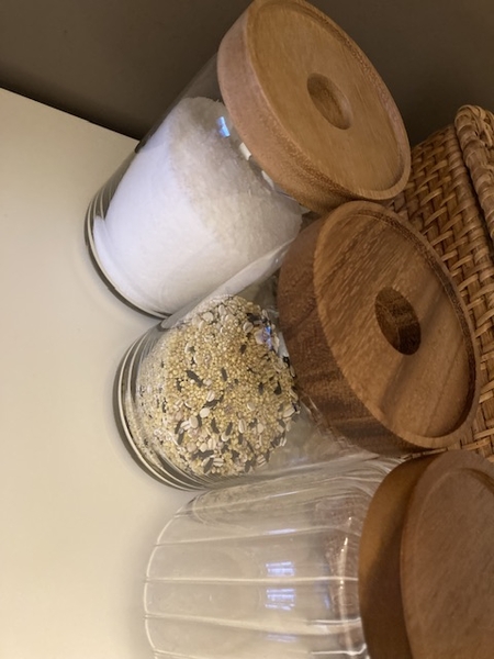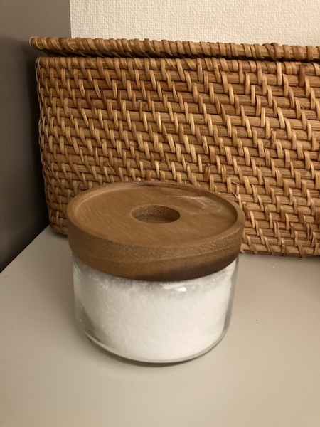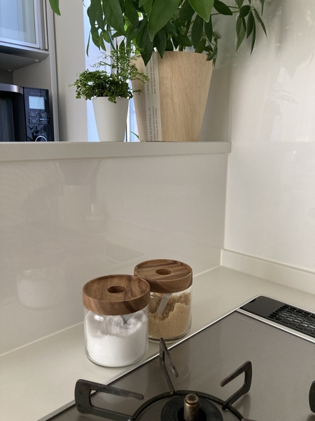 ガラスの容器にウッドの蓋がついているだけの、いたってシンプルなデザイン。シンプルがゆえに散らかって見える要素が排除され、入れて並べただけなのに、このように整って見えます。