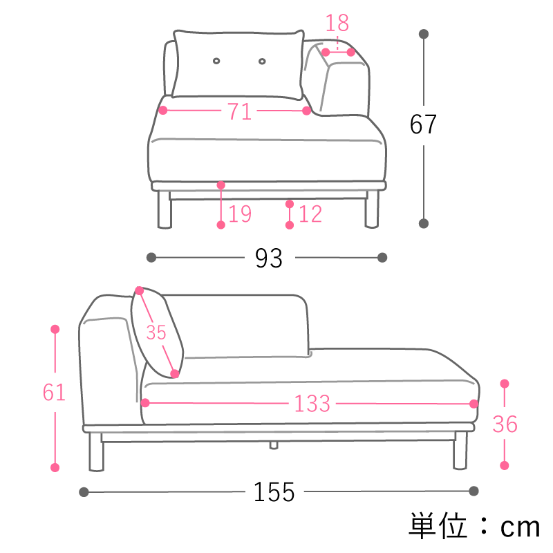 ・カウチソファーは、 幅 93cm × 奥行き 155cm