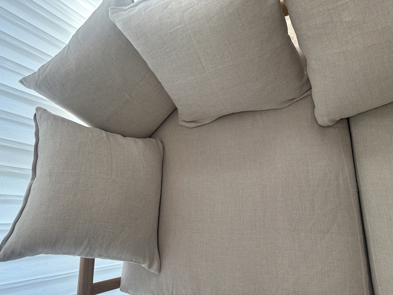 AGRAソファーは、フェザーをたっぷりと使用した構造により、見た目の柔らかさに反して、「へたりにくい」つくりになっています。フェザーは天然素材ならではの復元力が高く、空気を軽く含ませるだけで、ふっくらと形が戻りやすいのが特徴。
