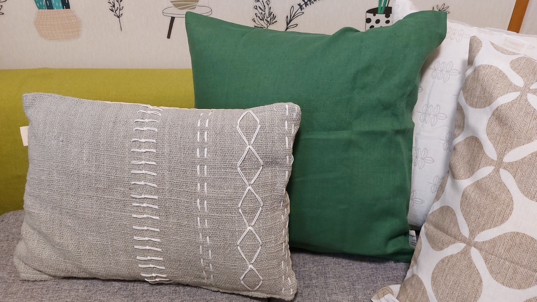 ナトゥーラを取り入れた空間が、その目の疲れを感じないのは、リネン素材だから。だれもが簡単に美しく取り入れられる明るいクッションカバーをセレクトしました。