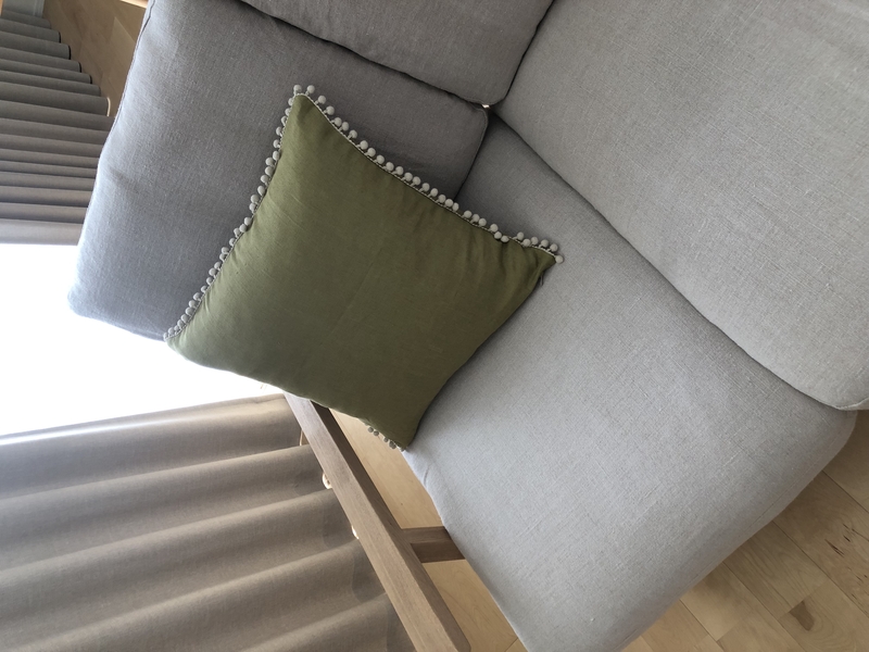 画像上は、ナトゥーラボンボンと、バラバラの素材・色のクッション2つを組み合わせたパターン。まとまりがなく、ちぐはぐな印象を受けます。