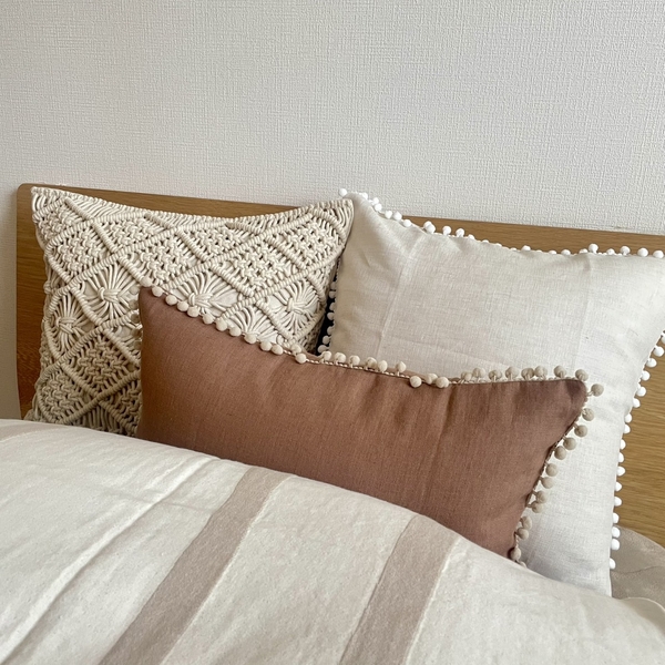リラックス感あるベッド周りを作りたい方は、ぜひ枕の前にクッションを2〜3つ並べてみてください。見た目が華やかになるのはもちろん、寝る前に読書をする時なんかにも便利です。