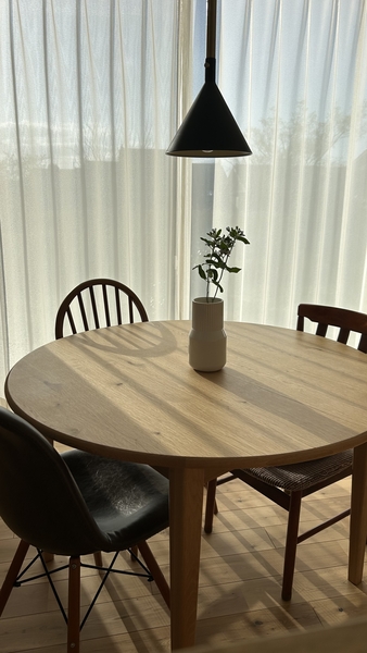 明るい色味や背もたれの抜け感により、圧迫感が少なく、コンパクトなダイニングにも合わせていただきやすいです。