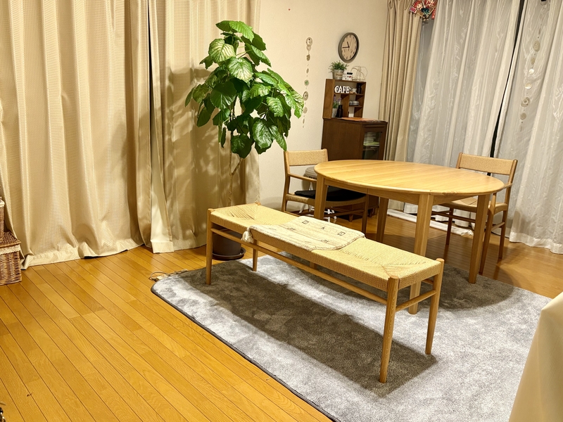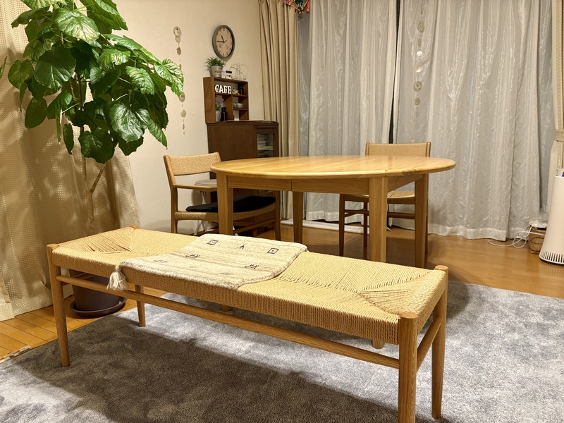 部屋の中心側の椅子をベンチにすることで、空間が広く感じて、とても気に入っています。