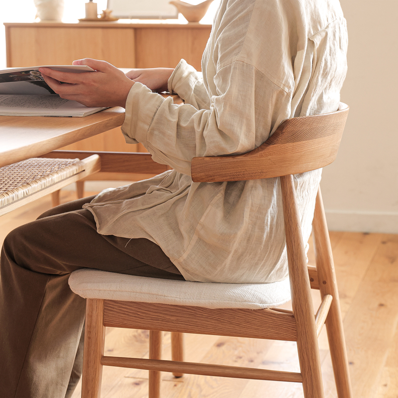 そこで私たちは、「アーム付きならではの快適さ」はそのままに、「ダイニングに収まりやすいサイズ感」を両立させることを目指しました。