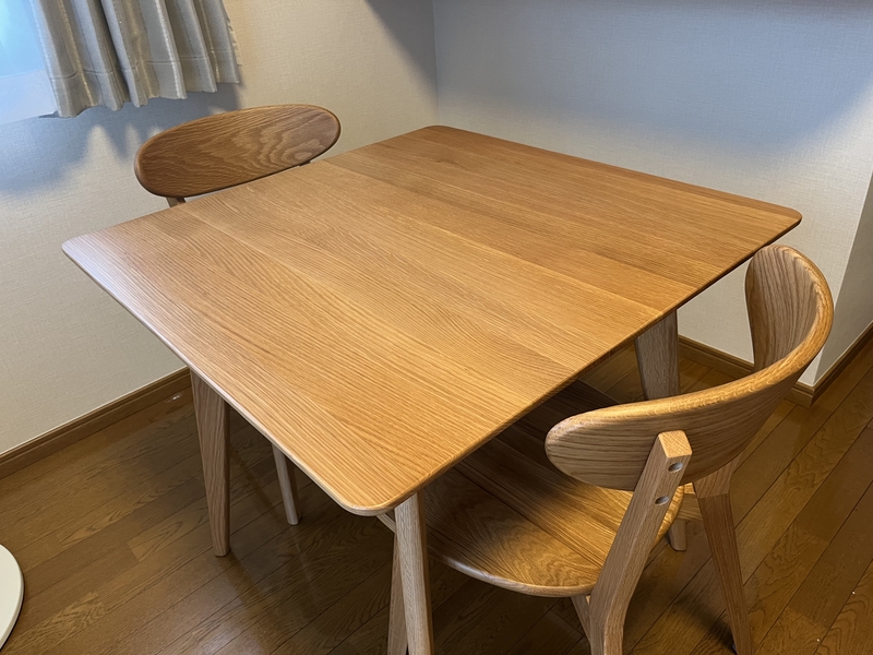 オーク材の美しい木目を活かしたデザインで、ぬくもり溢れる、落ち着いた雰囲気の食卓に。2人で使うのにぴったりなサイズ感で、ときにはデスク代わりとしても役立ちます。