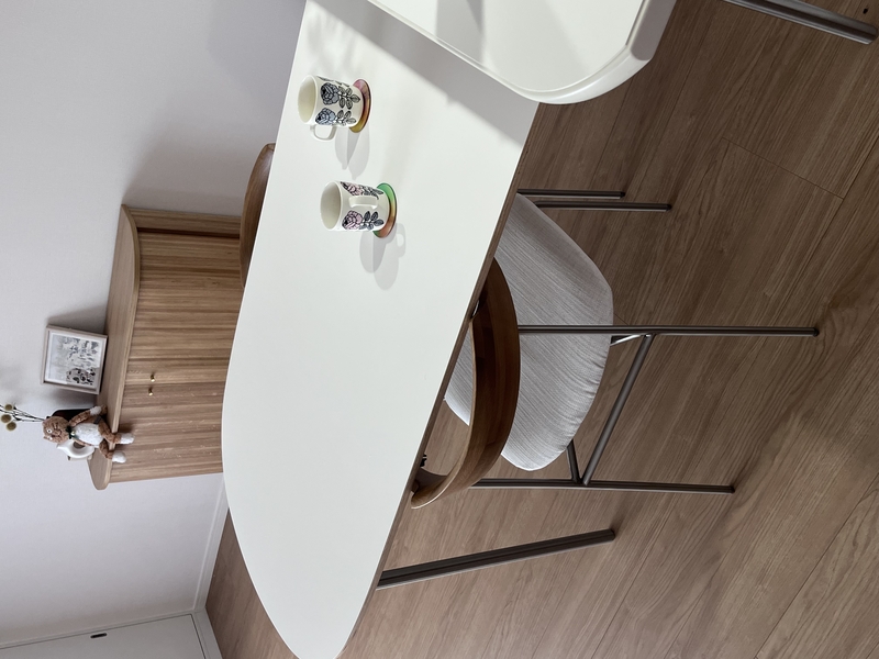 脚が細くモダンな雰囲気で、ハーフラウンドで柔らかさも兼ね備えている点がとても好きです。華奢なシルエットが、お部屋への圧迫感も軽減してくれているように感じます。今は椅子2脚ですが、4-5人は余裕で座れます。対面に座ったり、横並びに座ったり、楽しみながら過ごしています。