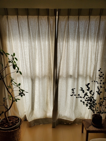 日差しが当たる窓際での様子。光を遮ってくれますが、遮り過ぎない程よい透け感で、読書をするにも問題のない明るさです。