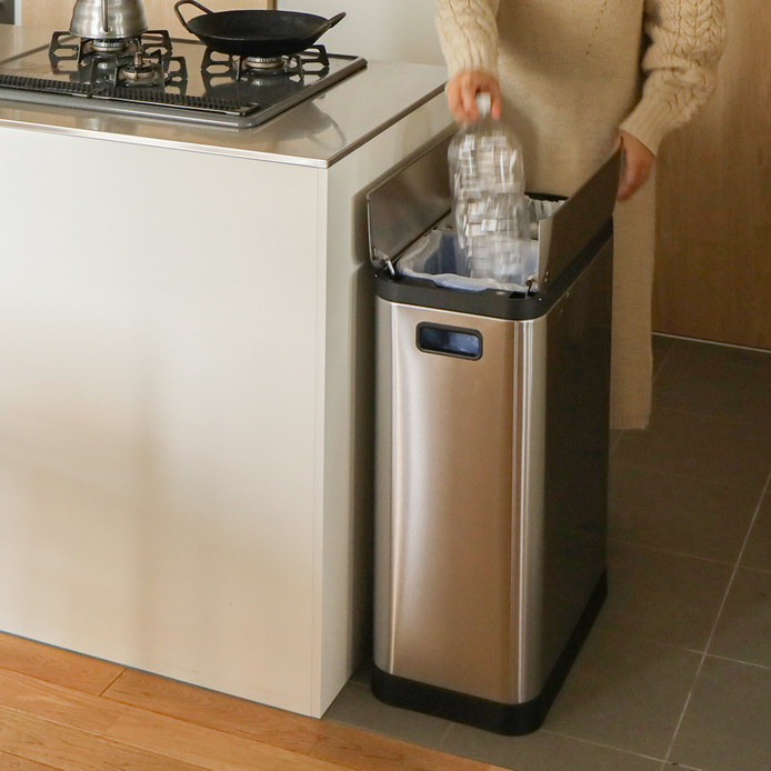 容量は使い勝手の良い40L。リサイクルゴミと一般ゴミがそれぞれに20Lずつ入ります。ゴミを捨てる入り口部分は少し狭めですが、ふたがしっかりと開くので、2Lのペットボトルが楽々入れられる広さです。
