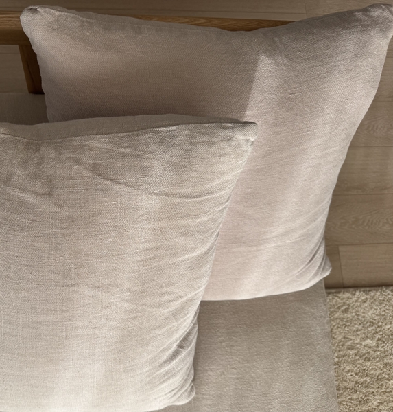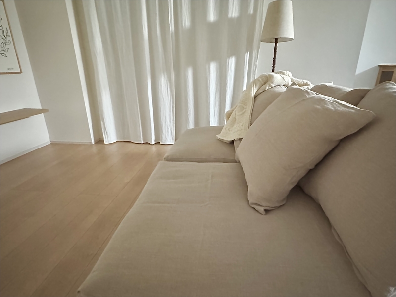 洗い替え用に購入しました。時期的にリネンはどうかな?と思いましたが、合わせるクッションはブランケットなどを温かみのあるものに変えれば全然大丈夫そうです。ブラウンのフレームにもバッチリ合いました。コーデュロイの生地と交互に大切に使おうと思います。
