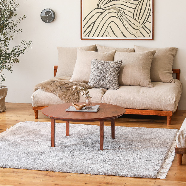 ソファー中心の生活なら、テーブル下に敷くコンパクトサイズでOK。ソファーの幅より左右10cmほど余裕を。