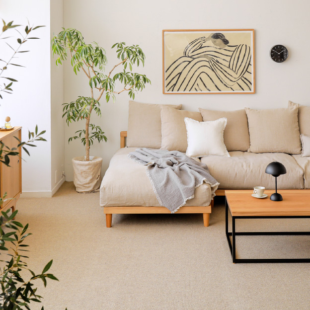 リビングの中心となるソファーを基準にすると、サイズ選びがスムーズです。また、床座かソファ、どちらで過ごすことが多いか、ライフスタイルによってラグのサイズ感も変わります。まずは、過ごし方から考えてみましょう。