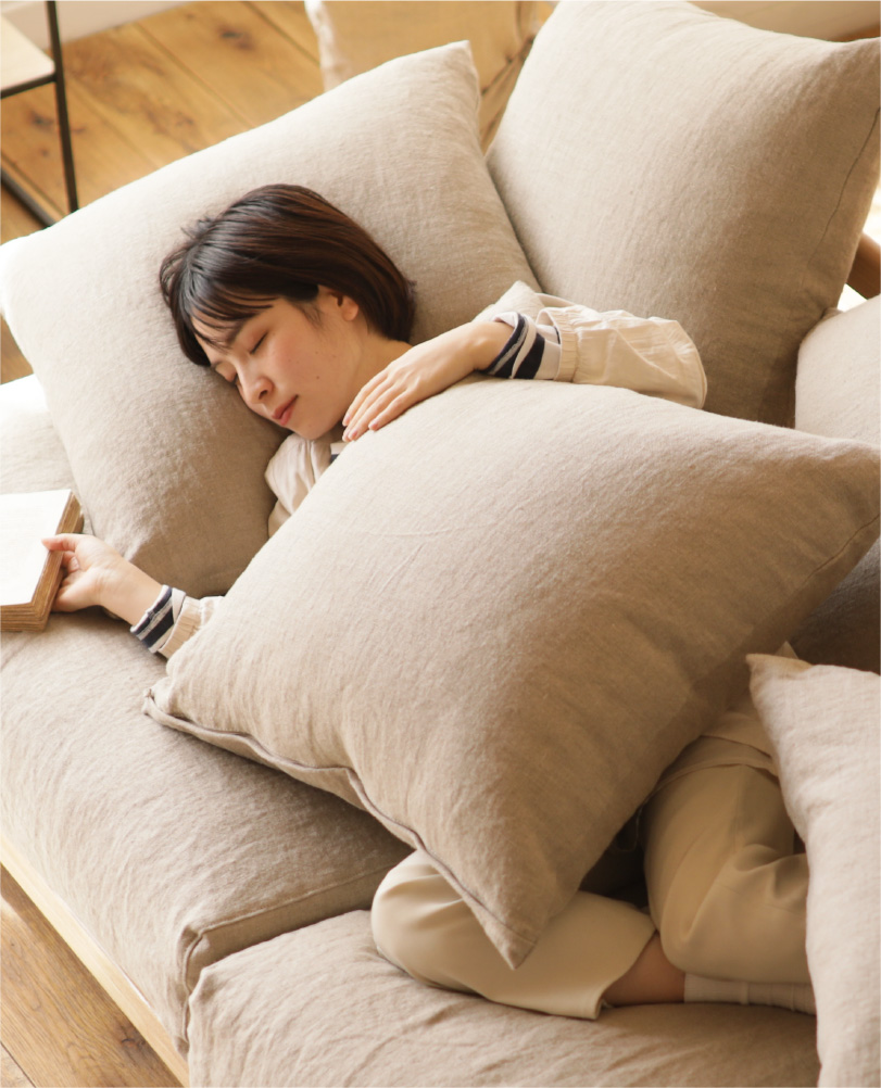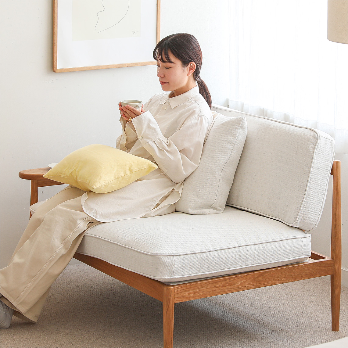 ソファーで横になってくつろぎやすいように、アームに小さな傾斜をつけています。頭にちょうどよくフィットするので、「置きクッション」を使えば、お昼寝にも最適。